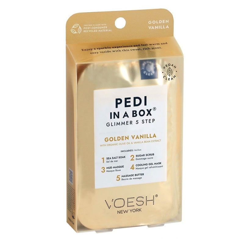 Le soin des pieds en 5 étapes à la vanille dorée de Voesh est un kit de pédicure tout-en-un. Il est idéal pour les pieds à la peau terne. Ce coffret de 5 soins des pieds à la vanille Pedi in Box Glimmer Voesh permet de nettoyer, d'exfolier, d'hydrater et d'apaiser les pieds. Les pieds sont transformés, la peau est plus douce et plus lisse. Ce kit de soins des pieds laisse les pieds scintillants grâce aux paillettes dorées présentes dans les différents soins. Grâce aux extraits de gousse de vanille, passez un moment de détente et de relaxation.